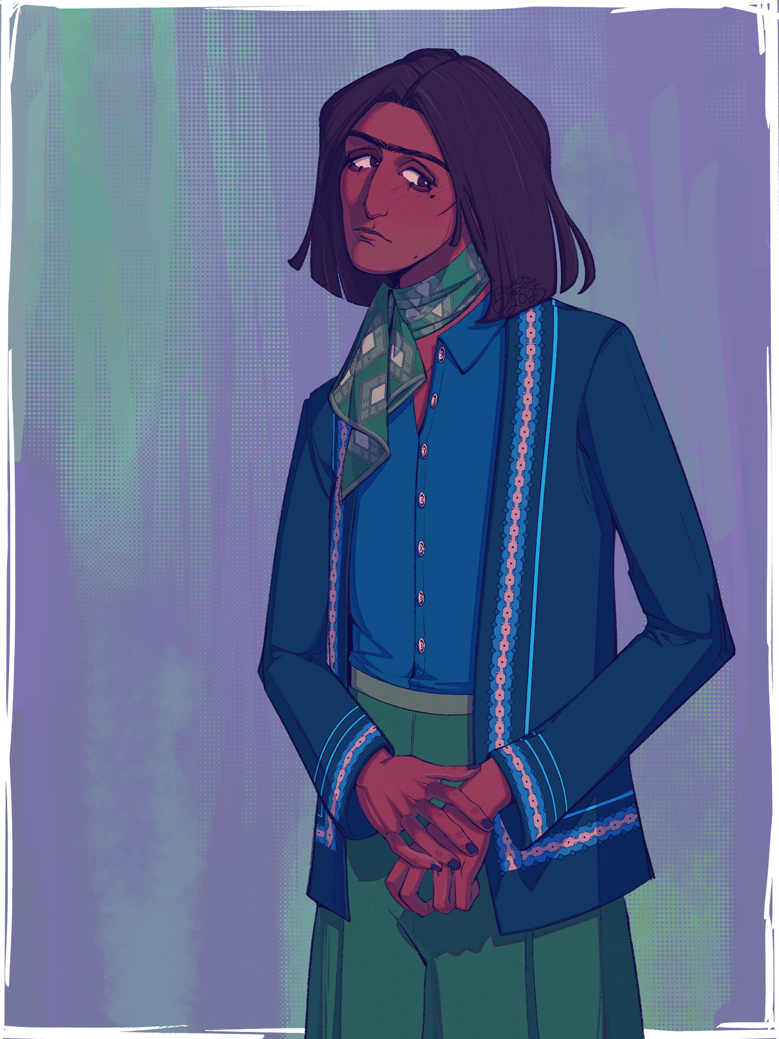 We're working with square, straight, uninteresting silhouettes for this one. Parîsa likes to play it safe. All markers of femininity can be taken off, as she isn't out at her workplace. Her work has encroached so much on her life that she refuses to do anything detectable or permanent to herself. There's no proof that she would be poorly-received at work, (although she lives in England, so take that with a grain of salt). She's just afraid of how she may be received. Of someone, somewhere, disapproving of her. This is the reasoning, among others, behind her conservative dress style. Other reasons include covering her own body as well as the fashions in the city she grew up in, Tehran. Particularly the street fashion--there's these square-silhouetted jackets everywhere that are really distinctive. There's also a distinctly wealthy vibe to her clothing. A lot of her clothing is custom, as buying anything fast-fashion makes her feel bad. Her personal style is what I would describe as "dandy masc" or perhaps "corporate masc."