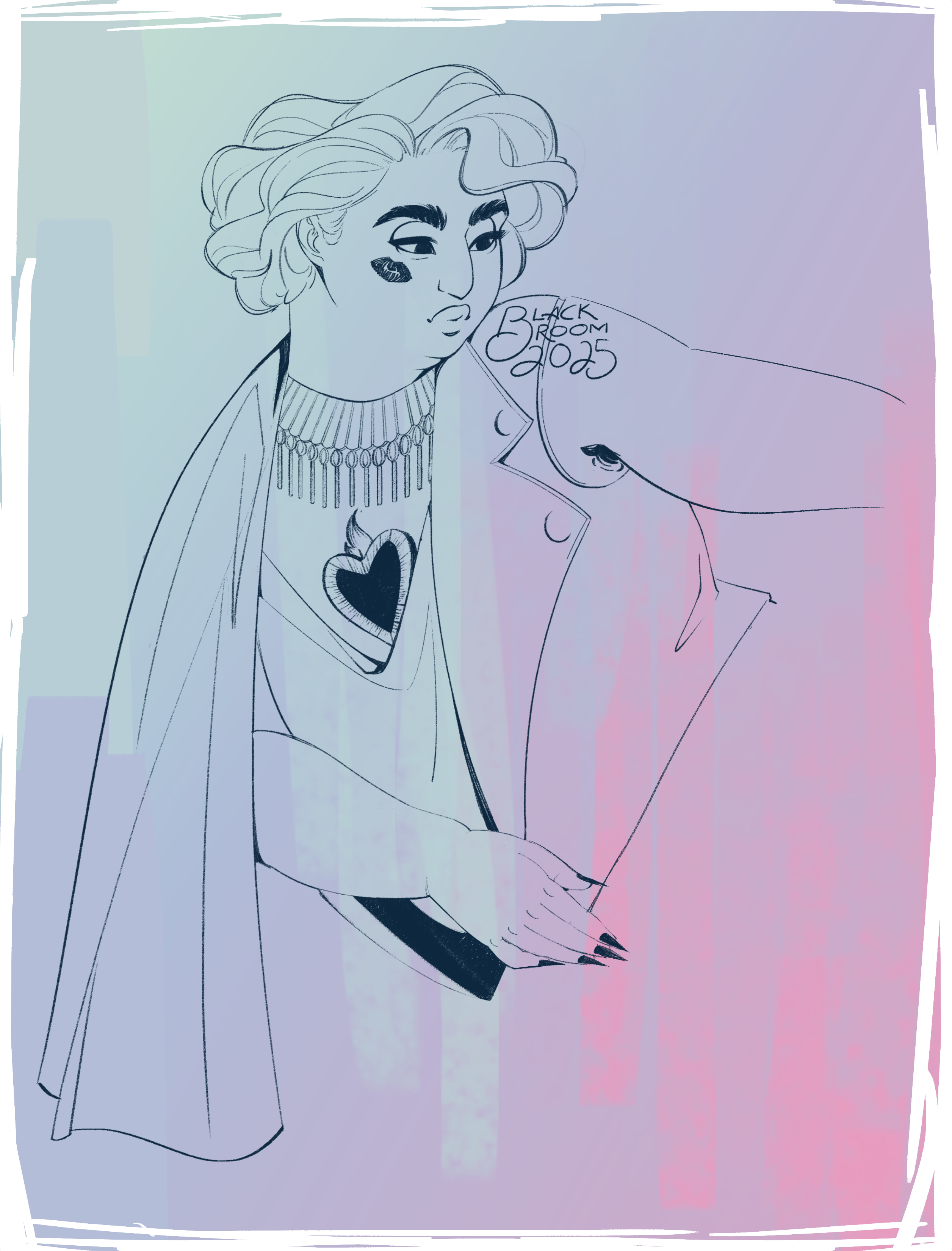 Working out my terror around not-entirely-clean lines. Didn't eliminate it, but we're getting there. I like a grittier line quality, and I think it went well with what I'm trying to convey. Sour Candy is sour-sweet. I wouldn't consider it dark, but it deals with darker subjects. Each of the three LIs is unloveable and loveable in their own way, for reasons some would consider "dark." Theo's reason I tried to convey through her design. She's not wearing a single article of clothing or accessory correctly. The earrings are mismatched, the blue eyeshadow tacky, the jacket off her shoulders, the corset unlaced, the belt halfway off, her phone shattered, her tights too tight. She is testing the seams of femininity and poking through to parody. This is her right and her aim. Perfect femininity doesn't suit her, though she has tried. So she has stopped trying, and often dresses in an over-the-top way both because she likes it and to draw attention to her own difference. She is not one to squat below grass level and hope the tiger doesn't notice her. I often think of poisonous coloring in prey animals with her. She is tacky, she knows, she likes it that way. Approach at your peril.
